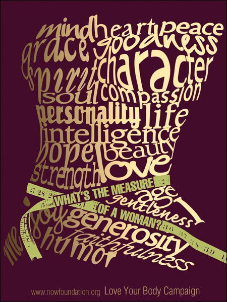 This clever poster from the Now Foundation’s Love Your Body Campaign plays on the images we usually see, and expect to see in the media, to give a more powerful message: that a woman’s worth is far more than the numbers on a scale or on measuring tape. Click here to download this poster.
