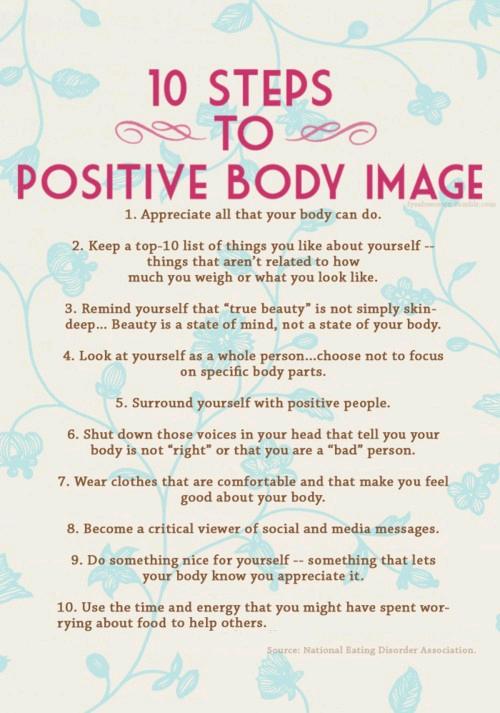This list of activities and steps to achieving a positive body image comes from the National Eating Disorders Association (United States) provides several good suggestions to cultivating a positive relationship with your body, including: